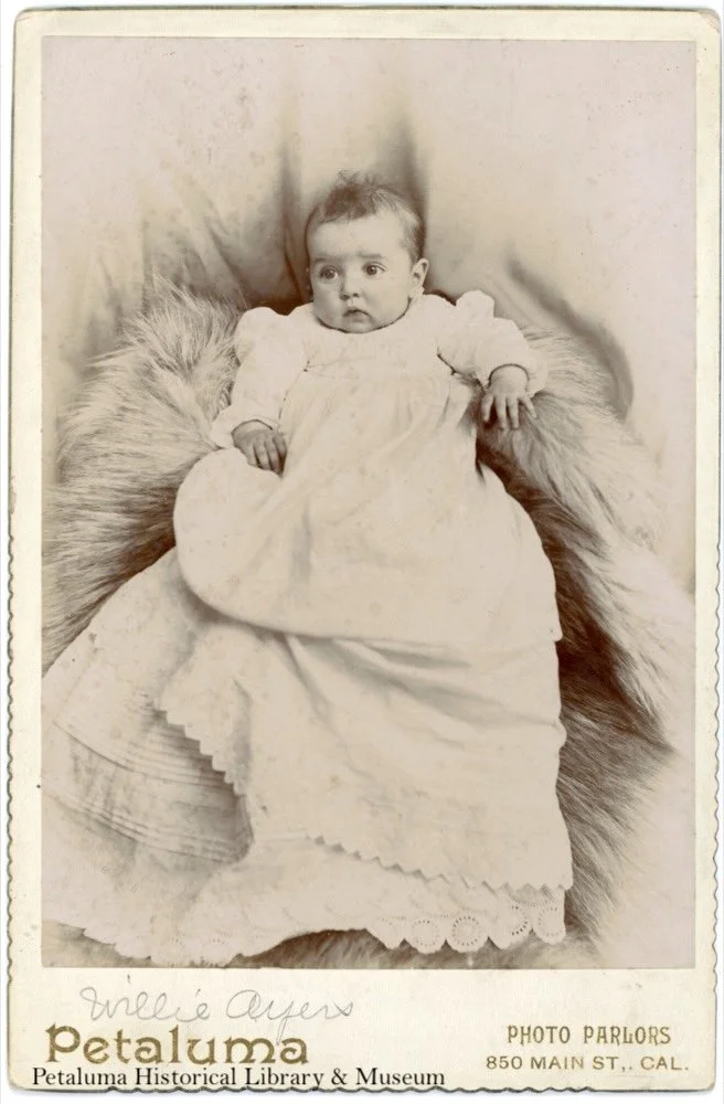 Family Affiliation: William David Ayers was the youngest child of early Petaluma pioneers William Ayers (1829-1899) and Martha Wade Ayers (1829 or 30 - 1890). In 1892, William married Ada Mae Carlisle Ayers (1875-1931). Together, they had at least three children: William D. Ayers III, Mervyn W. Ayers, and Harry W. Ayers. There are numerous additional portraits of the Ayers family members on this website. https://www.findagrave.com/memorial/125529520/william_david_ayers.